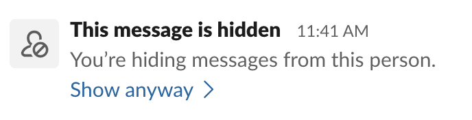 あるメンバーを非表示にすると、その人のプロフィール写真、名前、メッセージが Slack のほとんどの場所で非表示になります。その人はあなたと同じハドルミーティングに参加できますが、参加していることをあなたに知らせる警告が表示され、名前は非表示になります。
