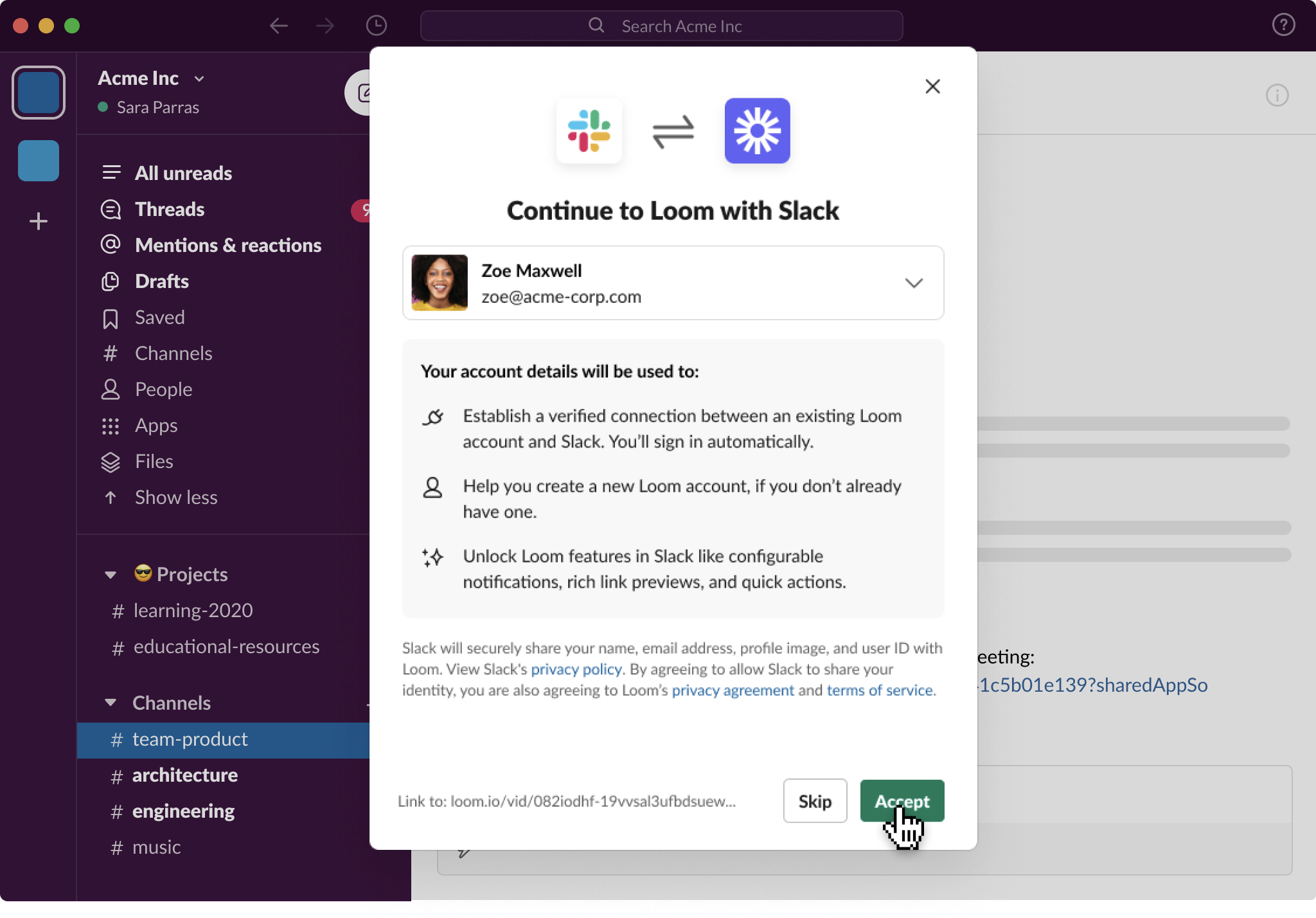ワークスペースのメンバーが、検証済みのサードパーティウェブサイトのリンクを共有すると、Slack から直接サードパーティのサービスにアクセスできます。リンクをクリックしたあと、アカウントがすでにある場合は Slack アカウントの認証情報を使用してすばやくサインインできます。まだアカウントがない場合は新規登録します。