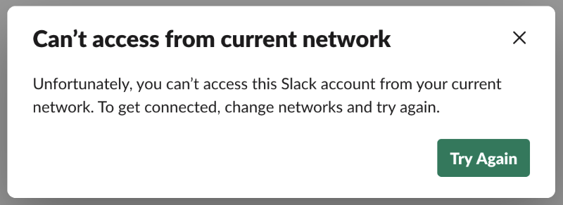 この設定を有効にすると、チームは承認済みの OrG やワークスペースにアクセスし、通常どおり Slack を使用できるようになります。承認されていないワークスペースにサインインしようとすると、エラーメッセージが表示されます。