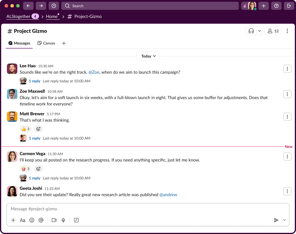 Slack デスクトップアプリのシンプルレイアウトモードを使用すると、Slack のセクションが一度に 1 つ表示されるため、集中して取り組むのに役立ちます。このモードでは、レイアウトが簡素化され、集中の妨げになるものが最小限に抑えられるため、シングルタスク型のユーザーやアシスティブテクノロジーを利用するユーザーに役立つと考えられます。