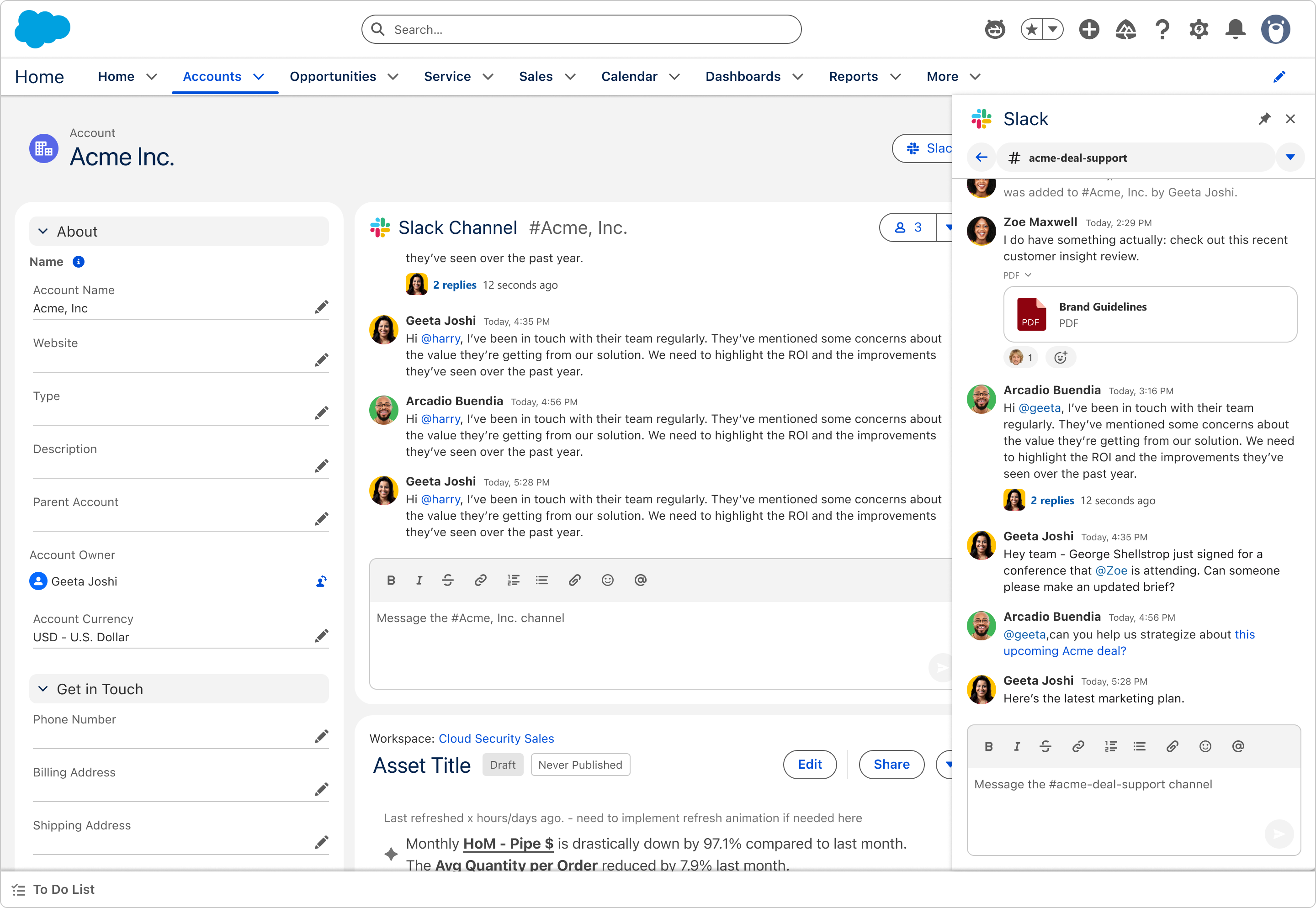 Slack 대화를 Salesforce Lightning에 바로 가져오세요. 사용자는 특정 레코드와 연결된 관련 채널 및 스레드를 확인하고 상호 작용할 수 있으므로, Salesforce를 벗어나거나 비즈니스 맥락을 놓치지 않고도 실제 토론에 계속 참여할 수 있습니다.*