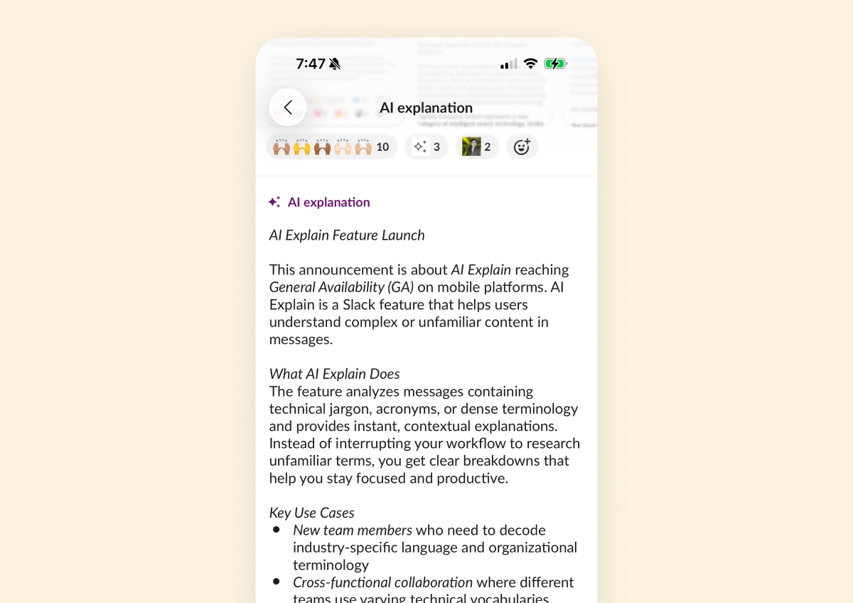 사용자가 이동 중에도 전문 용어, 약어 또는 복잡한 메시지들을 빠르게 이해할 수 있도록 도와줍니다. 모바일에서 메시지를 길게 누르고 ‘설명’을 선택하면 대화에서 벗어나거나 흐름을 끊지 않고도 명확하고 맥락에 맞는 설명을 확인할 수 있습니다.***