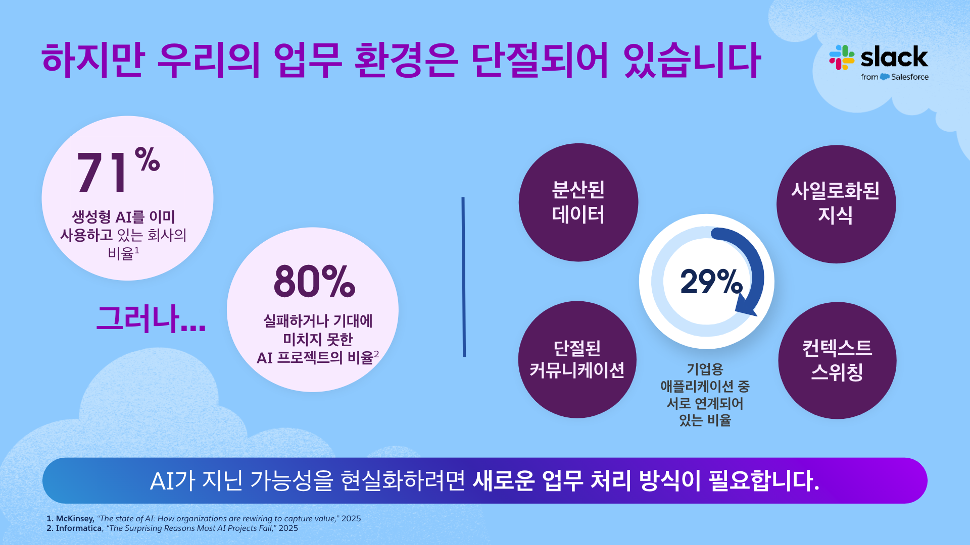 사람과 AI 에이전트가 협업할 수 있는 구조, 그리고 여러 애플리케이션과 데이터가 하나의 플랫폼 안에서 연결되는 환경이 필요합니다. 이것이 바로 Slack이 제공하는 업무 방식입니다.