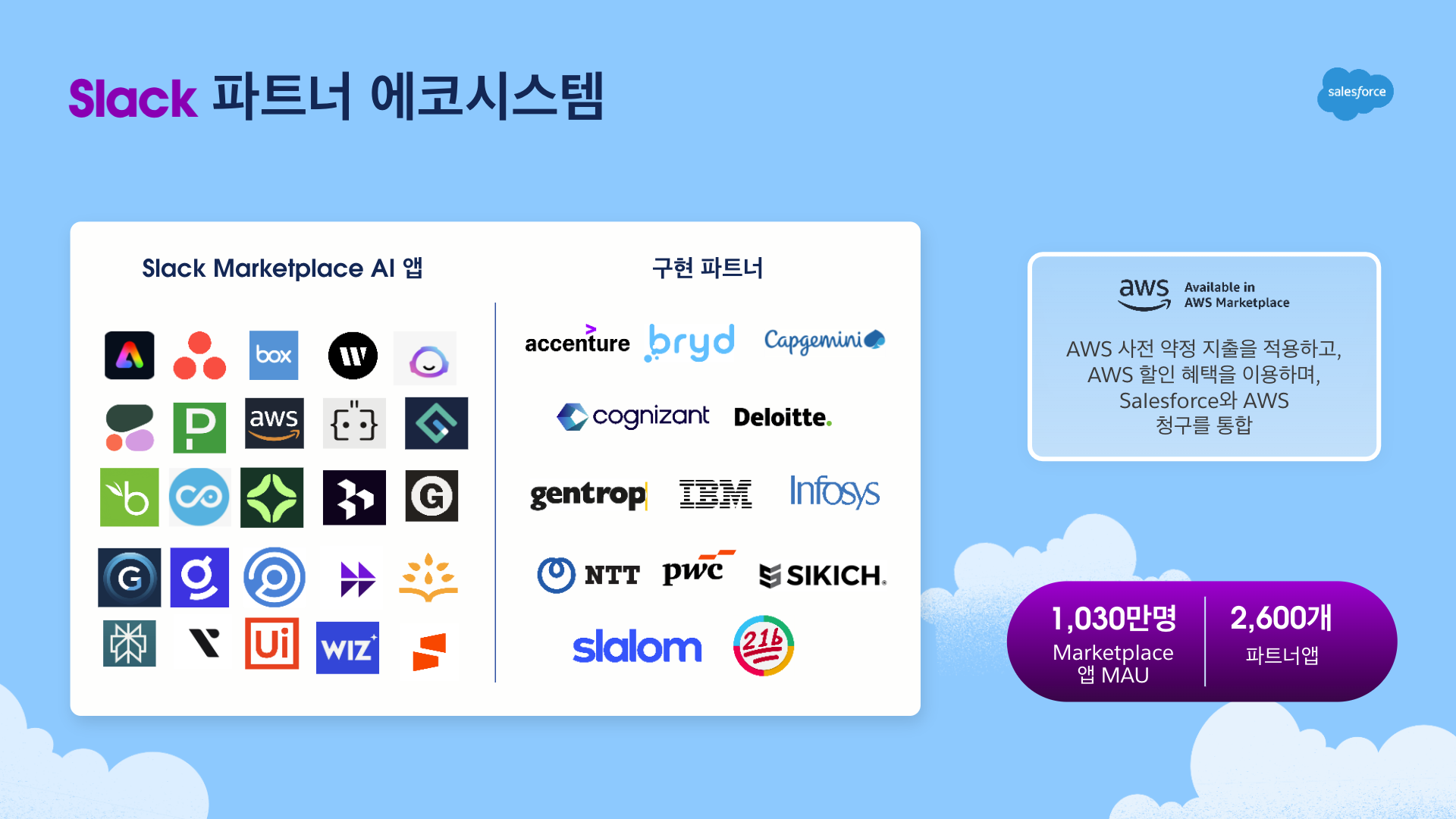 둘째, Salesforce 완전 통합입니다. CRM 데이터를 Slack에서 바로 조회/수정하고, IT 티켓 생성, 고객 케이스 처리, Tableau 리포트 연결이 가능합니다. Salesforce UI 없이 Slack에서 영업/서비스 업무를 실행할 수 있으며, Channel Expert AI 에이전트로 FAQ 자동 응답도 운영할 수 있습니다.