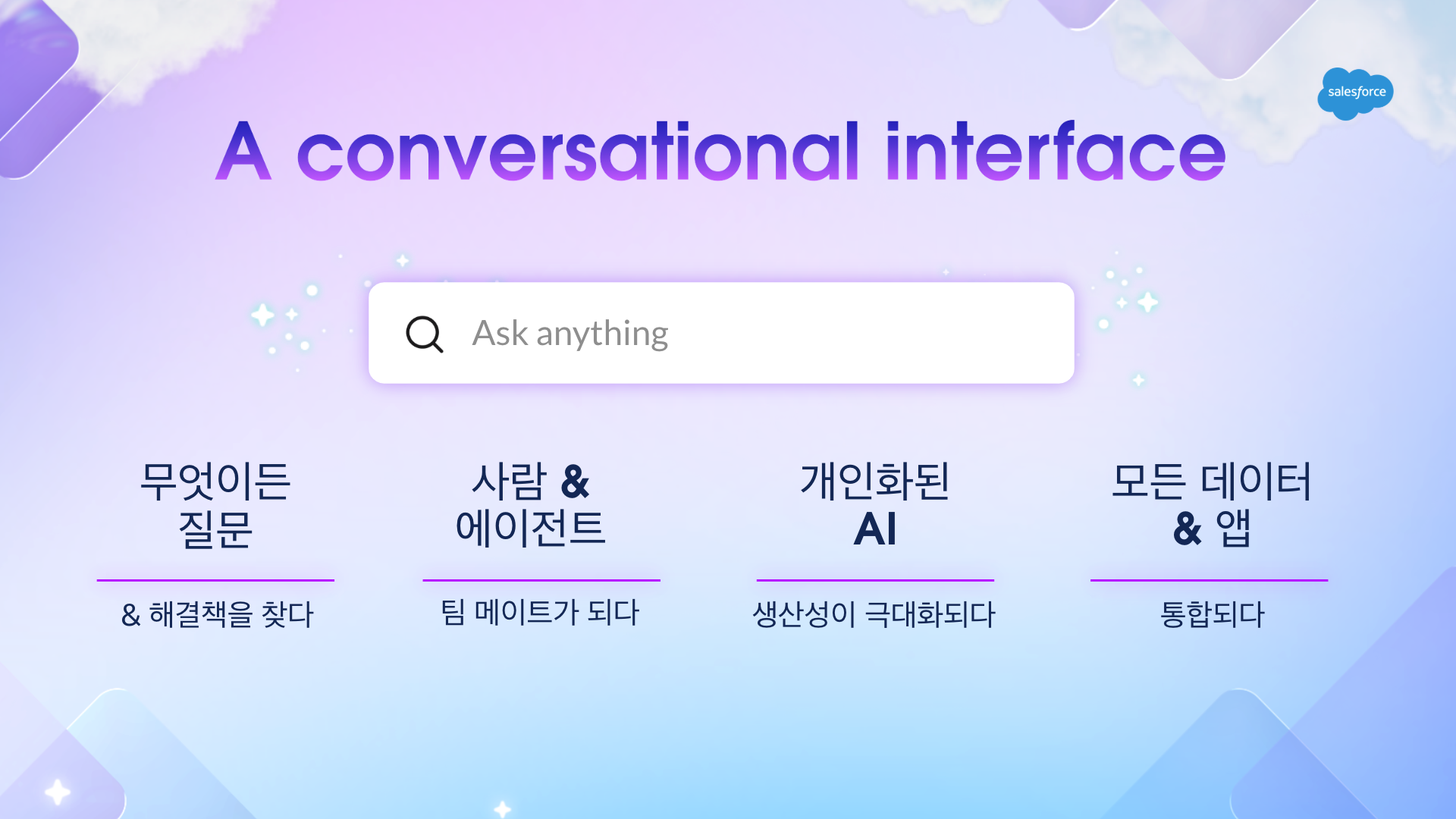 해법은 대화형 인터페이스 기반으로의 전환입니다. 기존 업무 방식은 메뉴 클릭, 폼 입력, 화면 이동에 의존했습니다. 그러나 업무가 복잡해질수록 대화형 상호작용이 더 빠르고 효율적입니다. 그래서 지금 필요한 플랫폼은 사람과 에이전트가 함께 일할 수 있고, 여러 시스템과 데이터를 하나로 연결하며, 실행과 커뮤니케이션이 동시에 일어나야 합니다. 바로 Slack입니다.