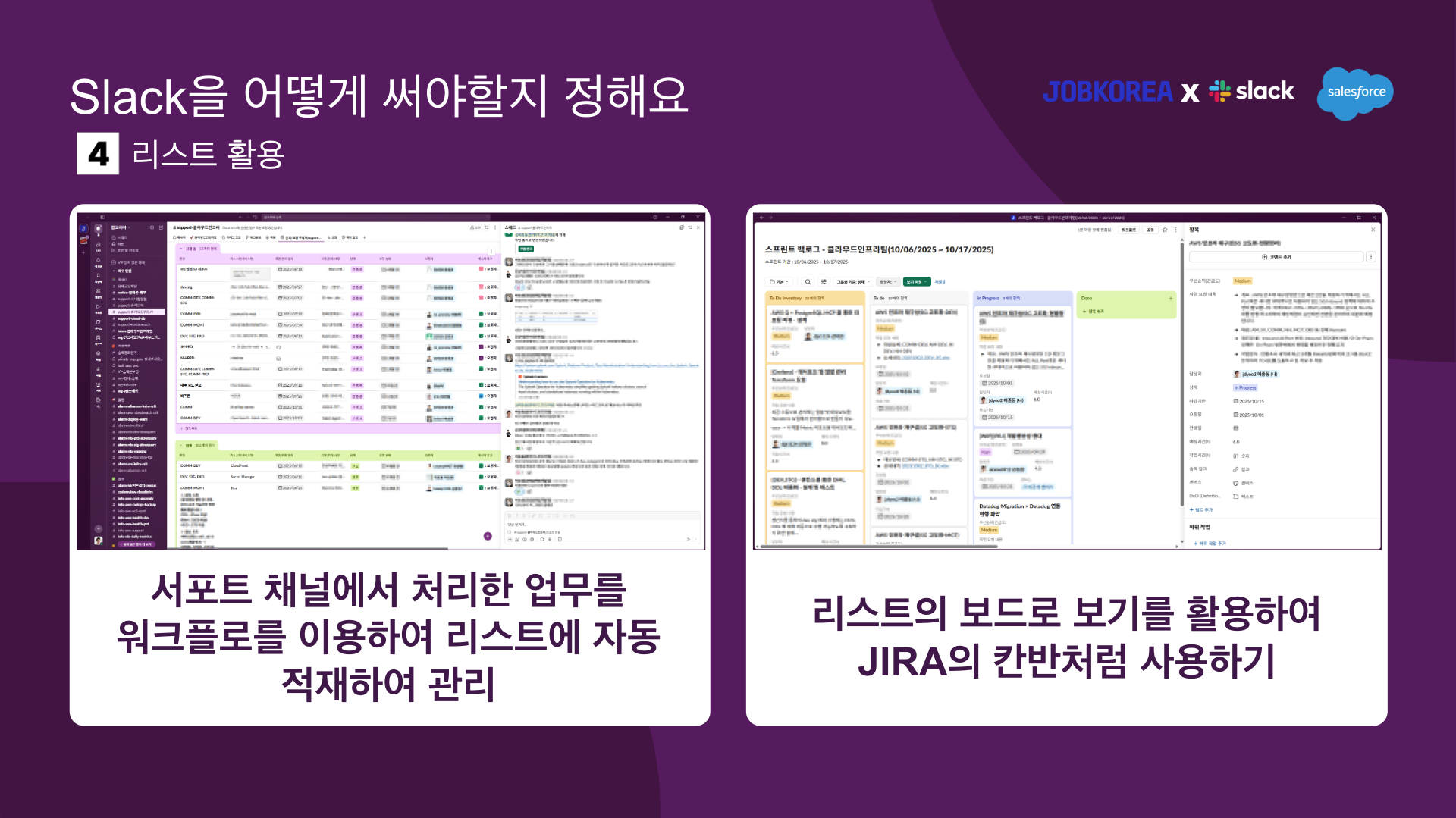 솔루션: Slack 온보딩 TFT를 구성해 Slack 챔피언즈 육성, 템플릿 표준화, 명확한 사용 원칙을 수립했습니다. Canvas를 활용해 템플릿을 표준자산으로 배포했고, Slack Lists로 비개발자도 “요청 수집 → 담당 배정 → 진행·완료 업데이트”를 쉽게 관리할 수 있게 했습니다. 내부 결재 시스템을 단순화하고, 사무용품·출입카드 수령 프로세스를 Lists로 체계화했습니다.