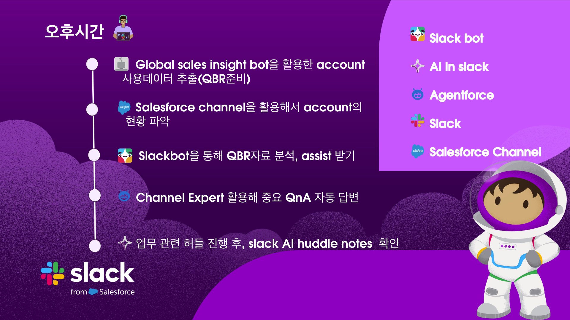 이어서 진행된 데모에서는 실제 영업·고객 관리·서비스 운영 시나리오를 통해 Slack과 Agentforce가 결합된 업무 자동화 경험을 생생하게 보여주었습니다.