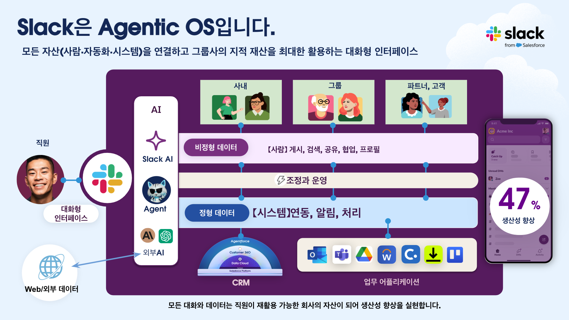 세일즈포스코리아가 제시한 답은 명확했습니다. 바로 Slack을 ‘업무를 위한 Agentic OS(Agentic OS)’로서 강화하는 것입니다. 사람, 앱, 데이터, 그리고 AI 에이전트를 하나의 플랫폼에 연결하여 반복 업무는 자동화하고, 팀이 더 빠르게 협업할 수 있는 환경을 만드는 것이죠.