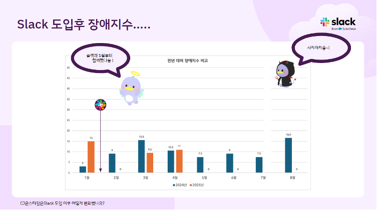 성과: 최근 6개월간 실시간 자동 점검 1,000회 이상, DB CPU 긴급 증설 4회로 중대 장애를 신속히 차단했습니다. 장애 지수(Impact Index)가 전반적으로 하락해 Slack 도입이 장애 인지와 대응 시간 단축에 실질적으로 기여했음을 확인했습니다.