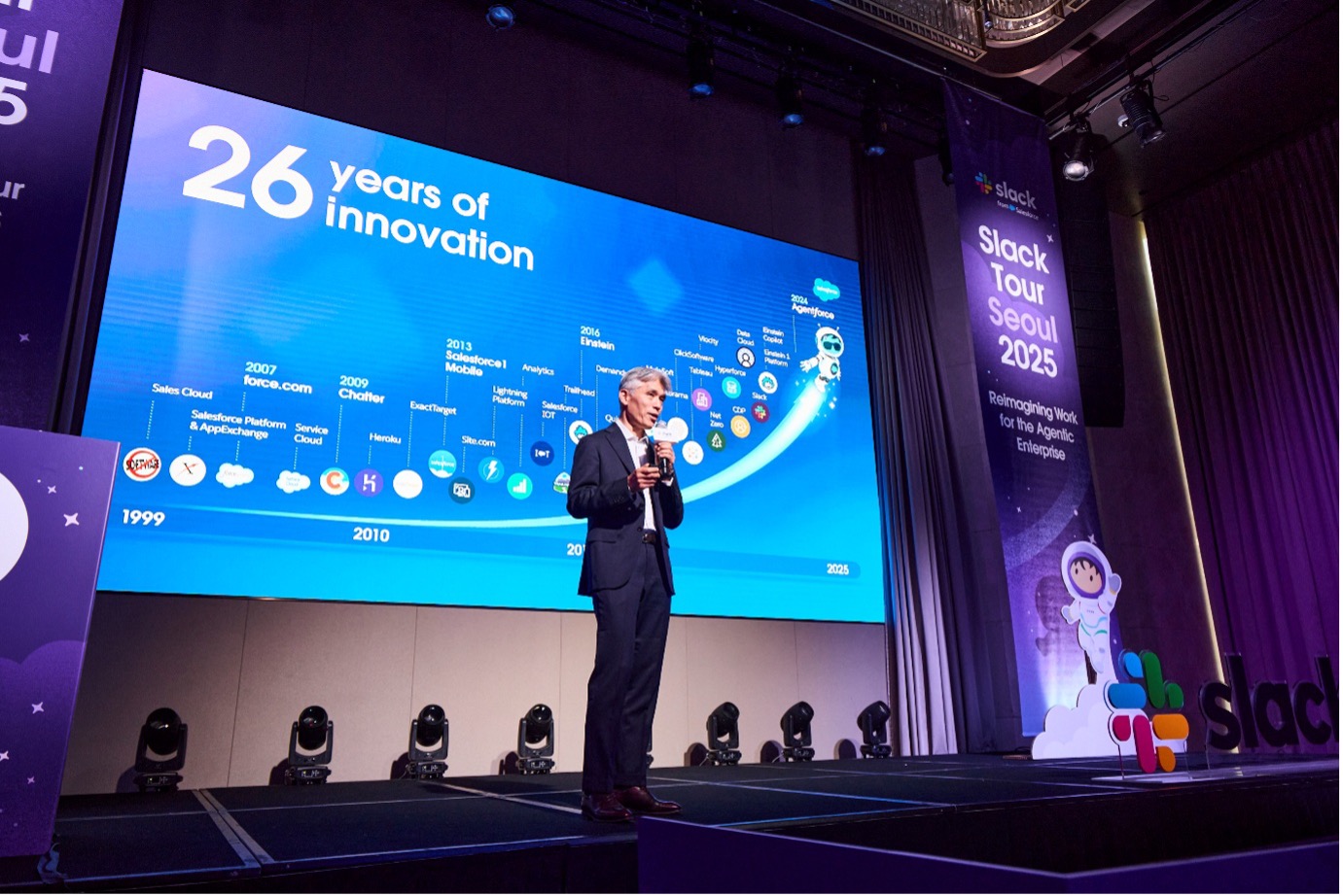 Slack Tour Seoul 2025의 개막은 Salesforce의 Atsushi Mito SVP가 열었습니다. Mito SVP는 Salesforce의 26년 혁신 여정을 소개하며, 클라우드에서 모바일, AI로 이어진 기술 진화가 이제 ‘에이전트 시대’로 접어들었다고 강조했습니다.