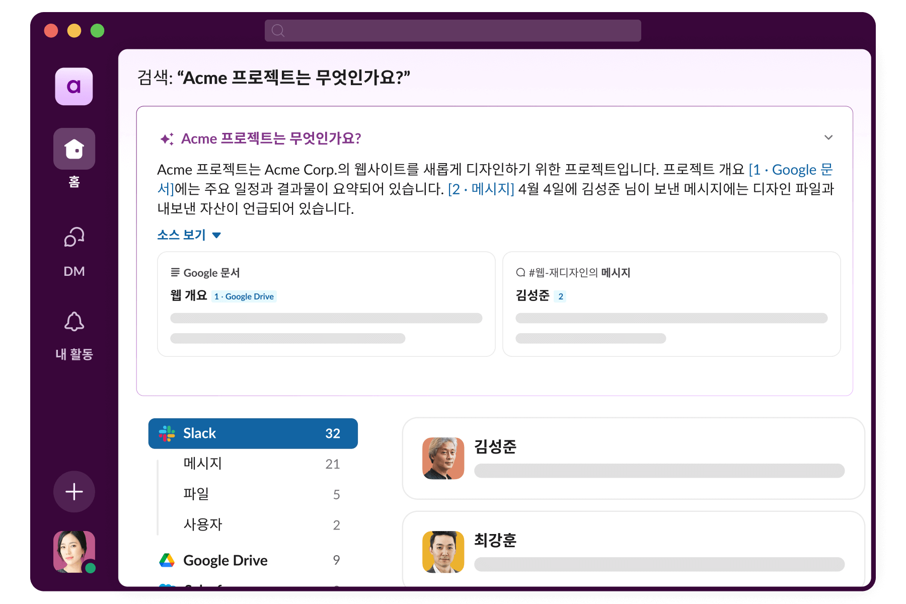 Slack의 엔터프라이즈 검색이 바로 이 문제를 해결해 드립니다. 엔터프라이즈 검색은 회사에서 진행된 모든 대화와 문서, 의사 결정 사항을 읽고 난 후 단편적 사실로부터 결론을 도출하여 필요한 정보를 제공하는 AI 어시스턴트처럼 작동합니다. 조직 내에 이미 존재하는 정보를 찾아 헤매는 번거로움을 없애주죠.