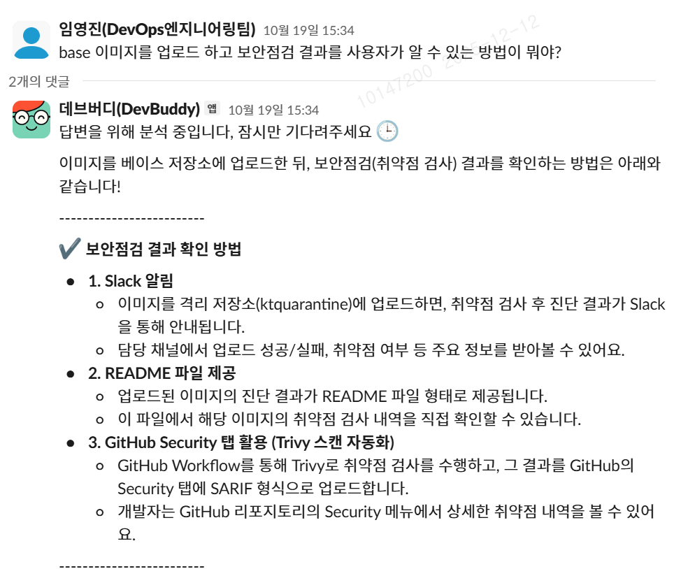 DevOps엔지니어링팀을 비롯한 부문내 여러 부서에서는 개발 환경에 최적화된 사용자 지정 앱을 직접 개발하는 문화도 자리 잡았습니다. Azure 환경으로 마이그레이션하는 과정에서 업데이트되는 CI/CD 정책을 확인하고 반영하는 데 불편을 겪던 개발자들을 위한 Dev-Buddy 봇이 대표적입니다. Confluence 문서를 Azure AI로 학습시킨 Dev-Buddy는 개발자의 질문에 따라 관련 정책과 문서를 즉시 찾아주는 위키봇인데요. 정보를 대신 탐색해 주는 봇 덕분에 개발자들은 문서를 하나하나 뒤질 필요 없이 Slack 채팅창에서 빠르게 궁금증을 해소하고 있습니다.