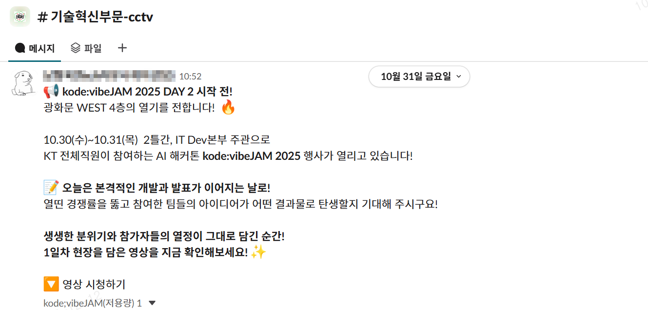 체육 행사에서 Slack 채널을 일종의 게임 운영 앱처럼 사용한 흥미로운 사례도 있습니다. 채널에 퀘스트 내용이 업로드되고, 각 조 조장이 스레드에 사진과 함께 결과를 올리면 다음 미션이 이어지는 방식이었죠. 이처럼 Slack은 KT의 협업 방식뿐 아니라 조직 구성원 간 거리감까지 줄여주며, 팀 간 교류를 촉진하는 매개체로도 자리 잡고 있습니다.