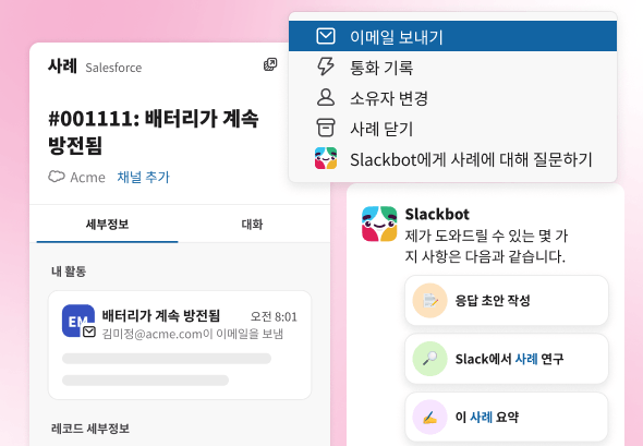오늘 필요한 일을 Slack에서 바로 시작하세요. 모든 대화와 연락처, 업데이트 정보가 백그라운드에서 Salesforce와 연결됩니다. 팀이 전체 CRM을 도입할 준비를 할 때 아무것도 이전할 필요가 없습니다. Slack에서 확인한 모든 정보가 이미 CRM에 저장되어 있습니다.