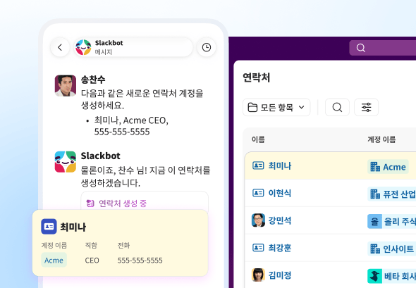 Slackbot은 채널과 대화, 고객을 파악하고 프롬프트에 따라 즉각적인 조치를 취할 수 있습니다. 새 계정을 생성하고, 최근 통화 내용을 기록하며, 레코드를 업데이트하는 등 모든 작업을 Slack에서 처리해 보세요. 요청하기만 하면 됩니다.