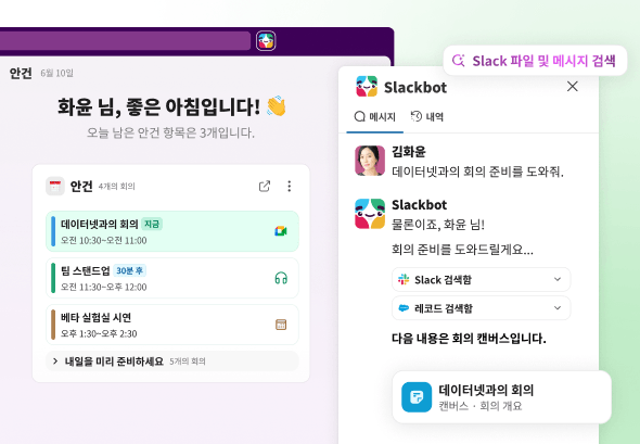 단 몇 초 만에 계정을 조사하고, 회의를 준비하며, 후속 조치의 초안을 작성하세요. 간단히 요청하기만 하면 Slackbot이 번거로운 작업을 처리하고 데이터를 최신 상태로 유지하므로, 팀은 고객과의 관계를 구축하는 데 더 많은 시간을 할애할 수 있습니다.