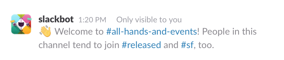 참여할 다른 채널을 찾는 데 도움이 되기 위해, Slackbot으로부터 채널 제안을 받도록 선택할 수 있습니다. 채널 제안은 내 활동을 토대로 하며 채널에 참여할 때 나에게만 표시됩니다.