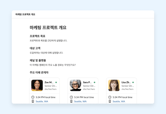 Slack에서 쉽게 협업하여 아이디어를 브레인스토밍하고, 타임라인을 구성하고, 캠페인을 실행하세요.