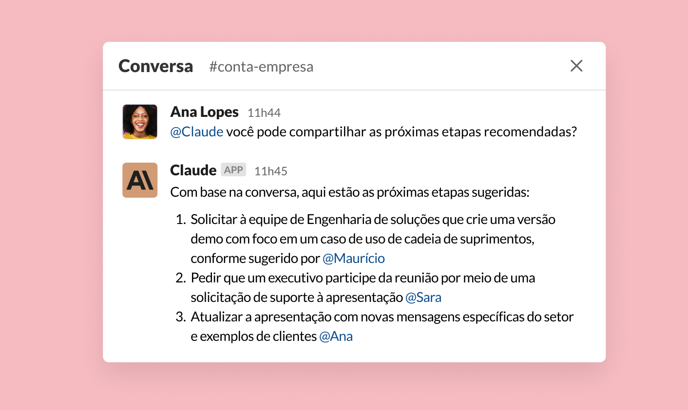 Hoje é possível integrar o modelo de linguagem de IA da sua escolha, usando apps de parceiros, como o ChatGPT, da OpenAI, e o Claude, da Anthropic, além de muito mais. Seja qual for sua escolha, os apps têm um papel fundamental na experiência de conversa do Slack. Basta uma mensagem para receber insights gerados com IA.