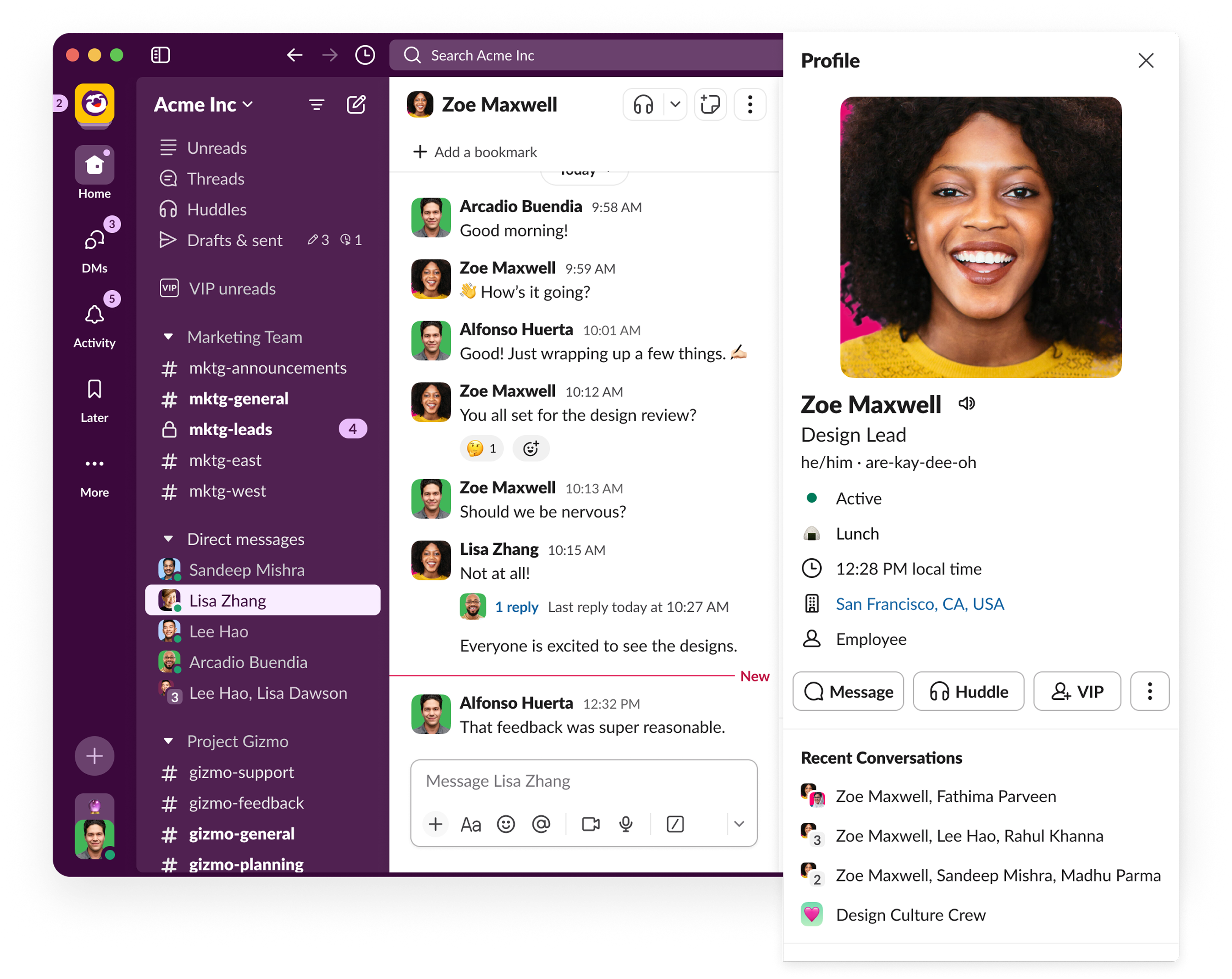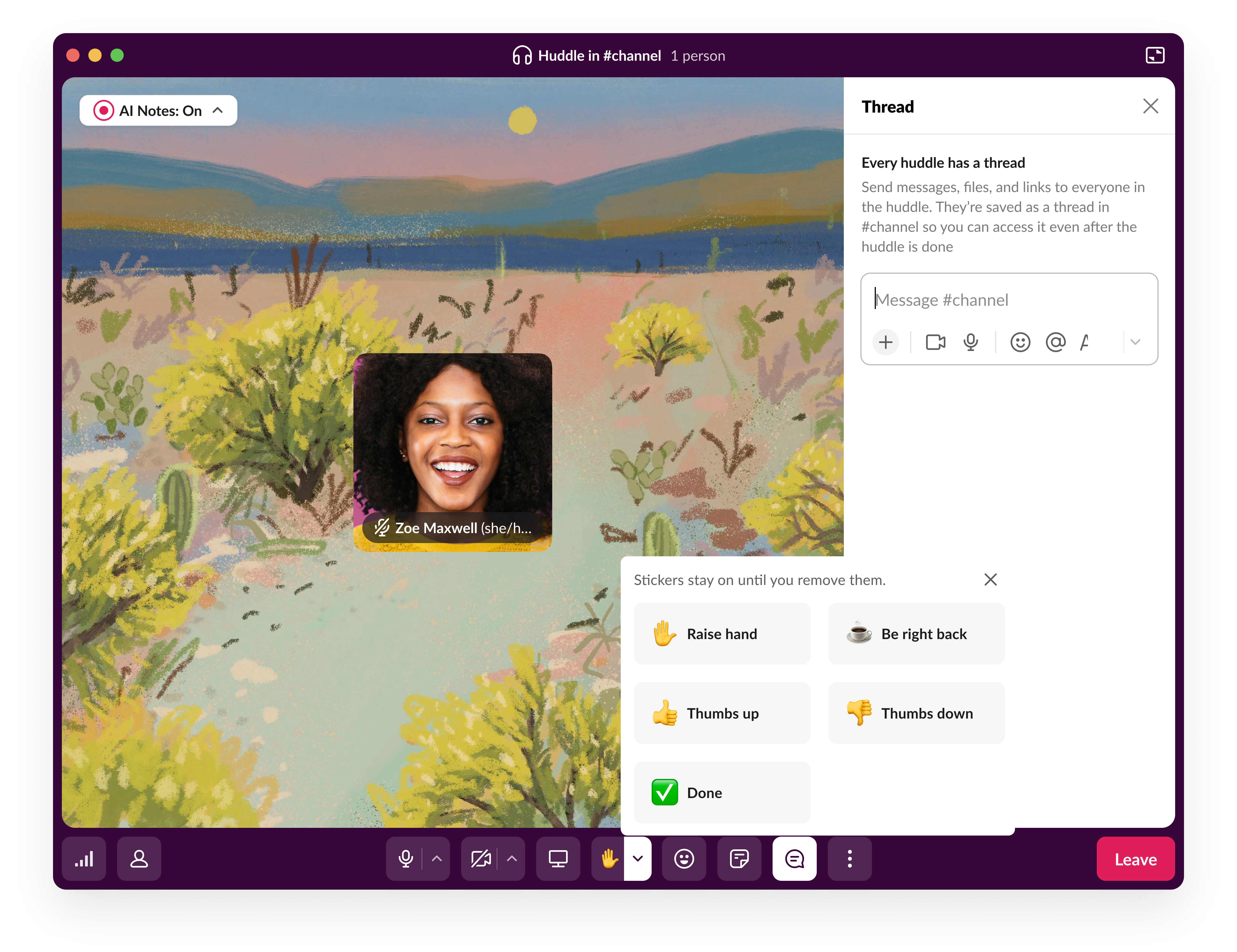 Apresenta um novo minirreprodutor de círculos, com barra fixa e barra de ferramentas redesenhada. Conversas, canvas, reações e controles agora ficam mais fáceis de acessar entre janelas, com agrupamento mais claro e acesso mais rápido durante a colaboração ao vivo no Slack.*