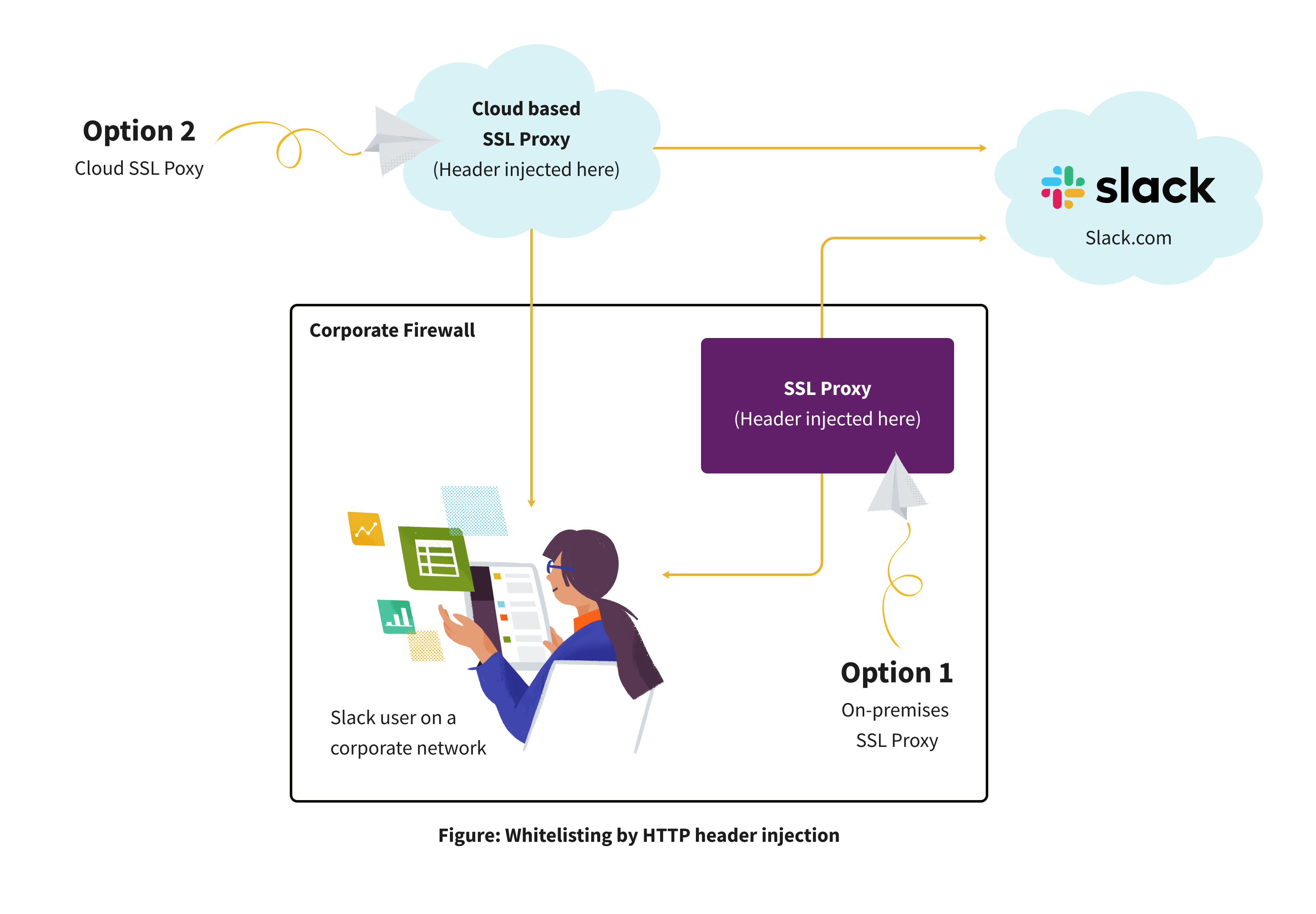 Os administradores de TI podem configurar um servidor proxy local ou baseado na nuvem para interceptar o tráfego no slack.com. O proxy insere novos cabeçalhos HTTP (X-Slack-Allowed-Workspaces-Requester e X-Slack-Allowed-Workspaces)que listam os workspaces que seus funcionários podem acessar.