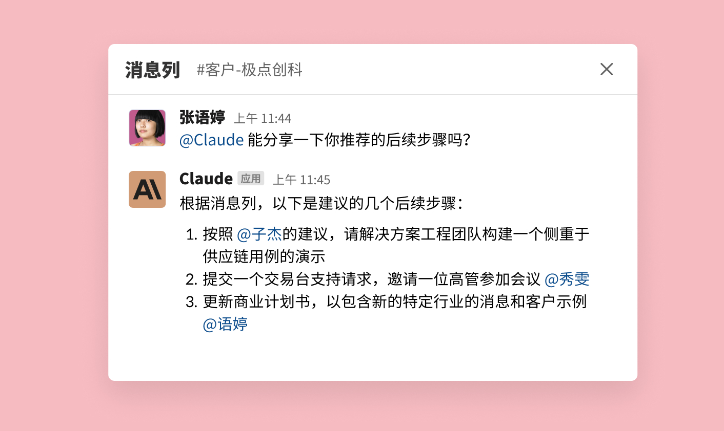 今天,你可以使用合作伙伴构建的应用(如 OpenAI 的 ChatGPT 和 Anthropic 的 Claude 等)来集成首选的 AI 语言模型。无论你选择什么,这些应用都是 Slack 对话体验中无缝集成的一部分,让 AI 提供见解只需一条消息就可实现。