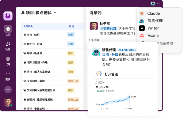 1. Agentforce:Agentforce 由 Slack 中最相关的对话数据和你信任的企业数据提供支持,能够提供建议并自动执行操作。你可以构建自定义代理,让员工在工作流程中就能享受到基于 AI 的高效生产力提升。无论是人力资源、IT、服务、销售还是其他领域,Agentforce 都能在 Slack 中执行各种操作,例如创建和更新频道、列表和画板。Slack 中的 Agentforce 即将推出;你可以与销售人员交谈,了解更多信息。