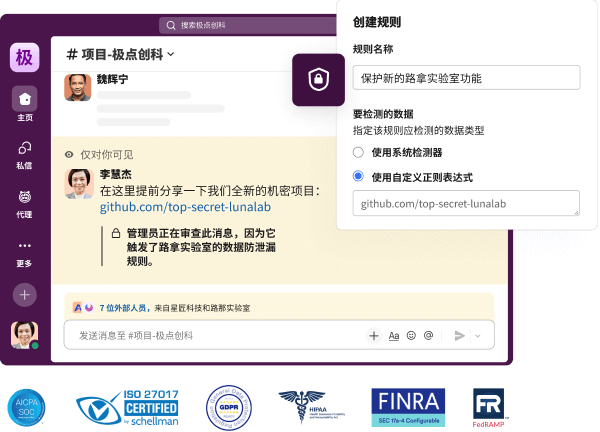 企业级安全是 Slack 的标准配置,内置了强大的治理、风险管理和合规性功能,以保护您的业务。通过严格的管理控制措施,例如单点登录、企业移动管理和数据丢失防护系统,我们将确保你的数据保持私密。