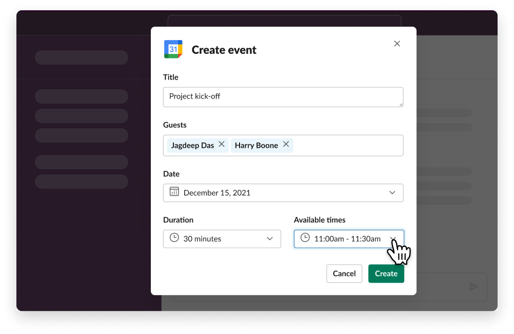 通过向 Slack 添加日历应用,你无需离开工作区,即可安排会议并邀请与你协作的人员。日历应用将显示你有空的时间段,并为你的活动推荐最佳时间。