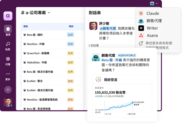 1.Agentforce:Agentforce 會利用 Slack 中最相關的對話資料和你所信賴的企業資料,提供動作建議並自動代為採取動作。建立自訂代理,幫助員工直接在工作流程中運用 AI 提高生產力。不論是人力資源、IT、服務、銷售部門,還是其他部門,都可以使用 Agentforce 在 Slack 中執行動作,例如建立和更新頻道、清單和畫板。Slack 的 Agentforce 即將推出;洽詢銷售團隊以深入瞭解。