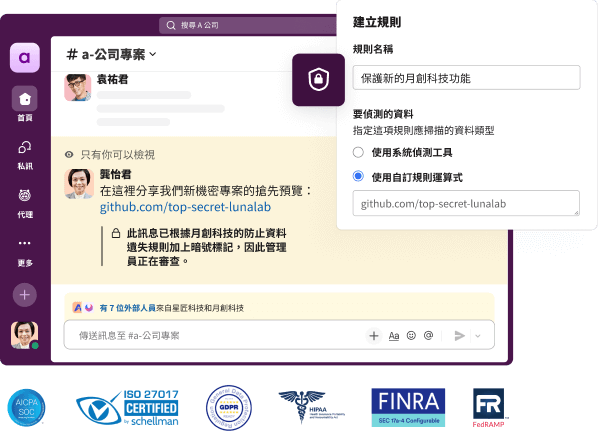 企業級安全機制是 Slack 的標準配置,當中包括完善的控管、風險管理與合規功能,以保障業務安全。我們透過嚴格的管理員控制選項,例如單一登入、企業行動管理以及防止資料遺失,確保你的資料不會外洩。